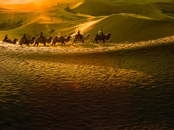 这张照片展示了一支驼队在腾格里沙漠中行进的情景。夕阳西下,金色的阳光洒满沙丘,给整个场景增添了一份宁静与壮美。驼队穿行画面中,增添不畏艰难氛围和勇于探索的情感。
