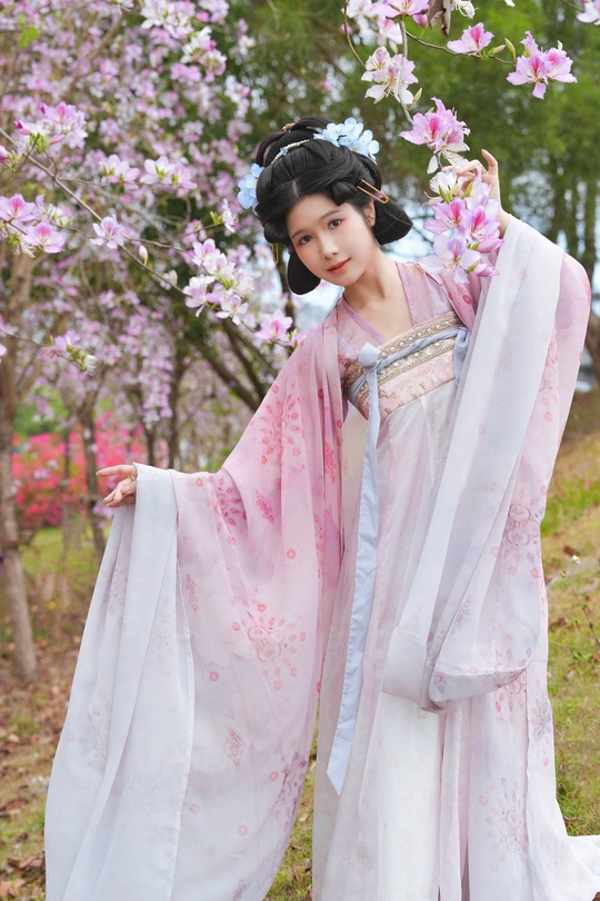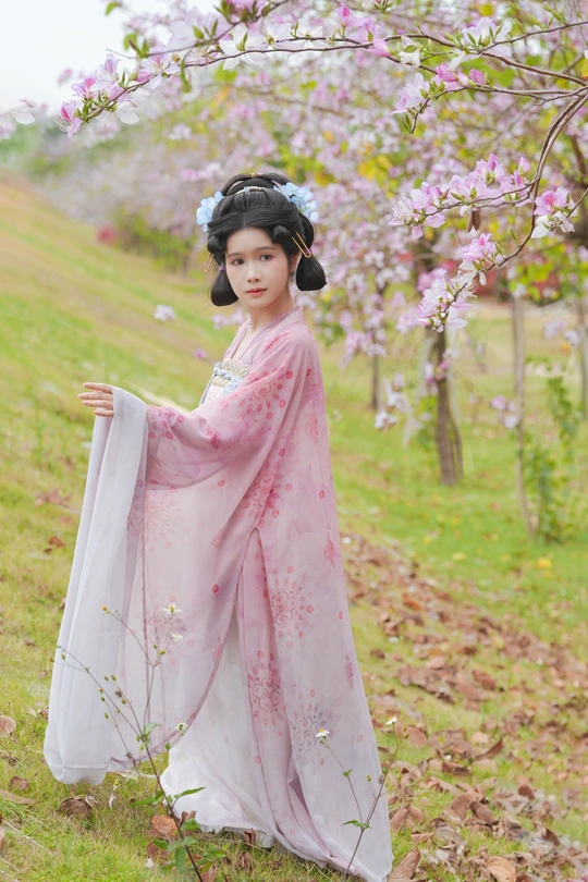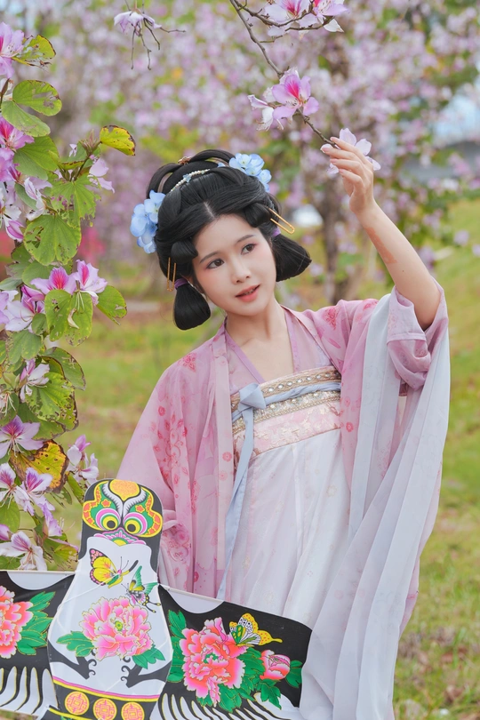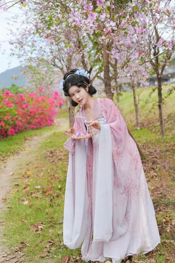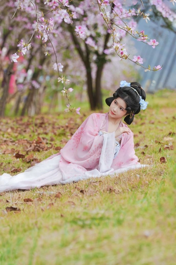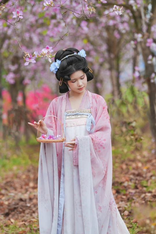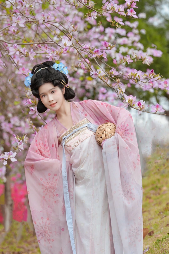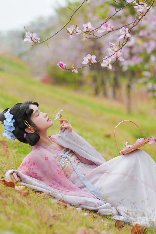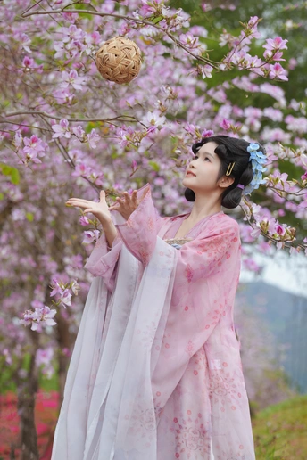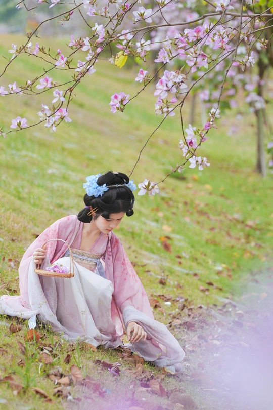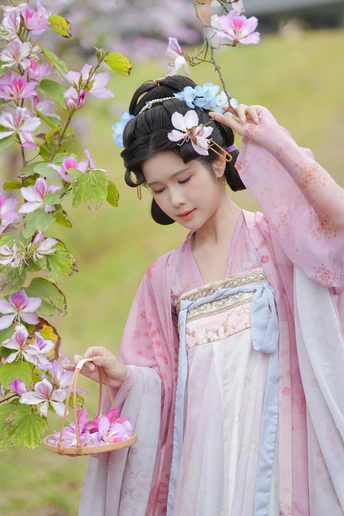 春日繁花间,她身着粉衣罗裳,于繁华树下轻抬素手。发间蓝花与粉枝交相辉映,竹篮里盛着瓣瓣落英。微风拂过,衣袂飘飘,她似是揉碎了春光,晕染出一副古韵悠悠的画,将岁月的温柔与诗意,尽览于怀。