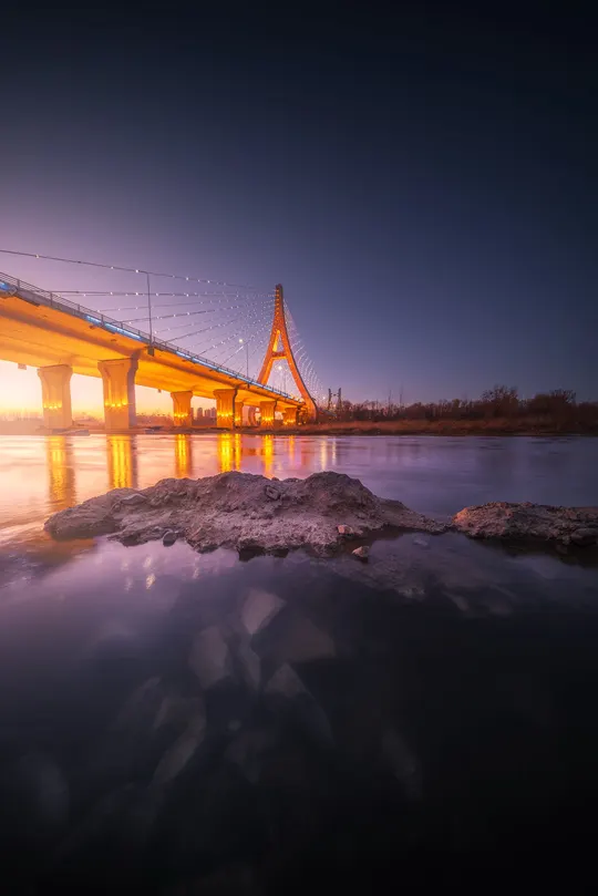 夜幕降临,洛阳凌波大桥在暮色中散发着独特魅力。暖黄色的灯光点亮桥身,与天空的幽蓝交织,倒映在波光粼粼的河面。岸边礁石静卧,河水潺潺,一幅静谧而绚烂的城市夜景图就此展开,诉说着洛阳的古韵与现代交融之美。