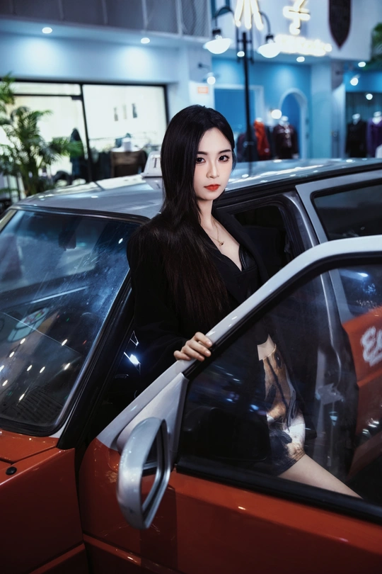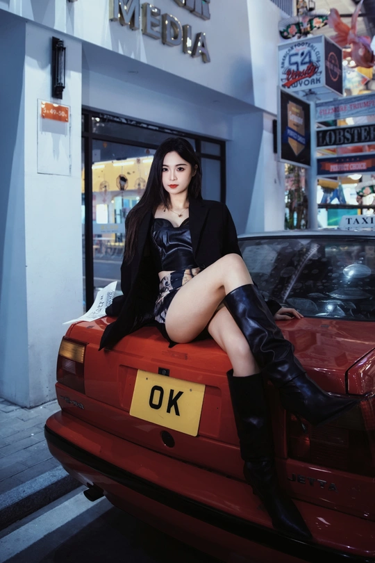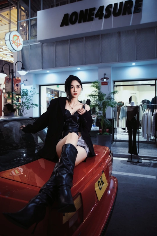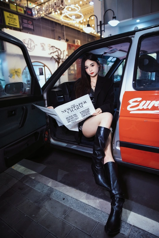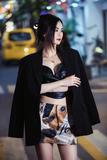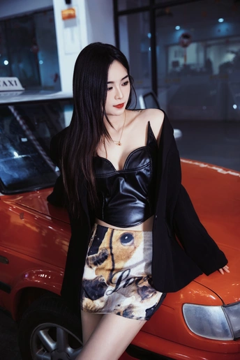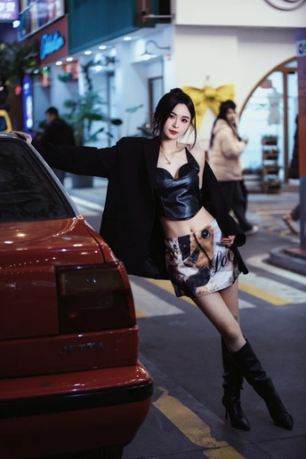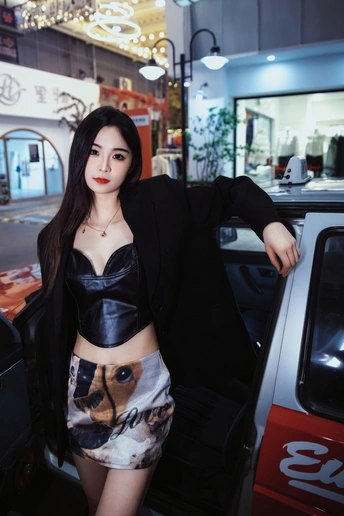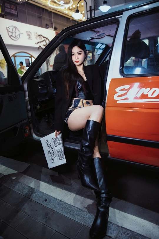 在霓虹闪烁的街头,红色出租车静静停靠。我身着个性穿搭,皮革与印花碰撞,是不羁态度的张扬。手中报纸似藏着城市秘密,于这繁华一隅,做夜的观察者,任喧嚣与自我交织,独拥这份摩登夜色里的自在。