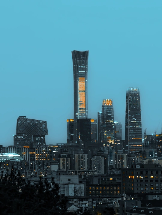 这张照片展示了北京的城市天际线,在黄昏时分显得格外迷人。高楼大厦林立,灯光逐渐亮起,给人一种现代都市的繁华感,独特色调运用展现画面中的氛围和建筑的独特美感。