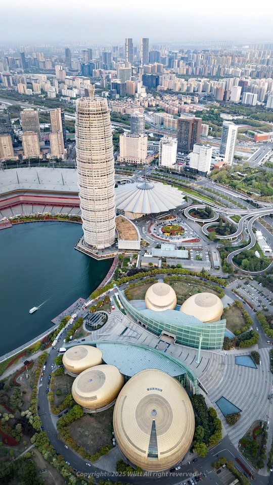 大家好,我是摄影师吴好甜 这次我带着我的小飞机来到了郑州 📍“中原第一楼”大玉米和脚下的河南艺术中心,以及远处的绿地双子塔,航拍视角下的这个画面,绝美! 2️⃣大玉米,作为一个外地人,除了二七塔,这里就是我对郑州的第一印象,很喜欢玉米楼 3️⃣河南艺术中心,俯拍视角下像巨人的脚,阳光洒来金光灿灿