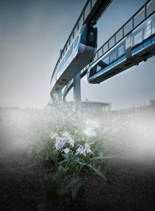 在西宛公园散步时,轻轨驶过,又看见公园小岛里有一堆小花,故拍
