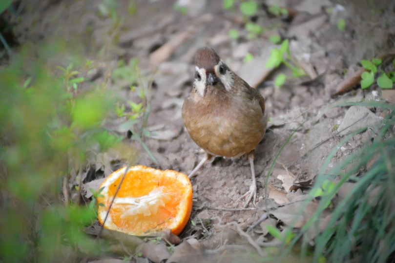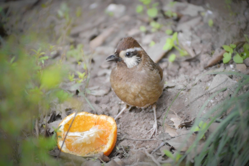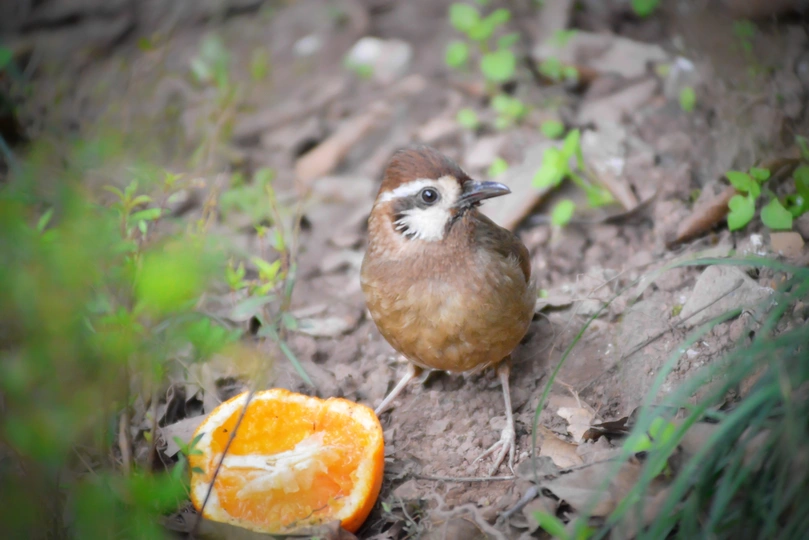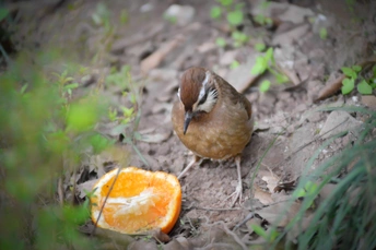 白颊噪鹛吃地上的半个橙子