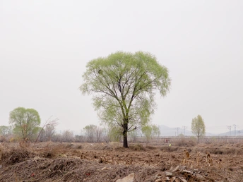 粗犷树干的沧桑感与柔嫩新叶的生命力、人工建筑的自然消隐与原生植被的蓬勃生机、冷灰基调的沉静与绿意萌动的希望,共同构成中国田园美学中"静观万物皆自得"的哲学意境。 Shot on Xiaomi 13 Ultra
