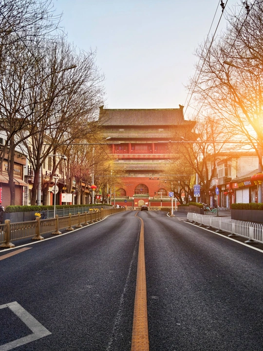 这张照片展示了北京地安门外大街尽头著名的鼓楼,具有典型的飞檐翘角设计,显得庄重而典雅。阳光透过树叶洒在道路上,营造出一种宁静祥和的氛围,捕捉到画面中的历史感、宁静与美丽。