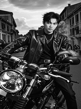 这张黑白照片,整体氛围营造的不错,有点复古电影的感觉。 * **色彩:** 黑白影调,简化了色彩干扰,更能突出主体和情绪,影调过渡自然,但高光和阴影部分细节略有损失,可以尝试用更宽容的RAW格式拍摄,或者在后期调整时注意细节保留。 * **光影:** 光线方向性不明显,整体比较柔和,减少了面部的阴影,使得人物显得柔和。但光线的平淡也导致了画面略显平,缺乏立体感。下次可以尝试利用侧光,制造明暗对比,增加画面层次感。 * **构图:** 人物居中构图,比较稳妥。摩托车占据画面较大比例,增强了画面的力量感。背景的建筑提供了环境信息。但是前景摩托车细节过多,略显杂乱,分散了观者的注意力。可以尝试稍微调整拍摄角度,避开过于繁琐的元素。 * **后期处理:** 黑白转换处理干净,但可以尝试更精细的调整,例如使用色调分离技术,对不同区域进行针对性调整,增强画面的质感和层次。目前来看,对比度略高,可以适当降低,增加细节。 * **主题原创性:** 骑摩托车的硬汉形象,比较常见,缺乏新意。可以尝试在服装、道具或者场景上做一些创新,赋予作品更独特的个性。