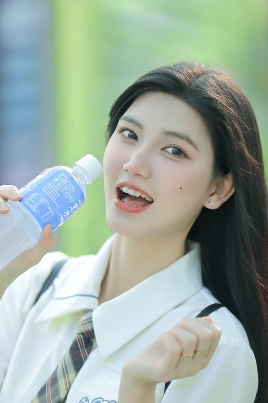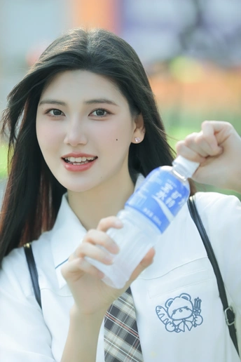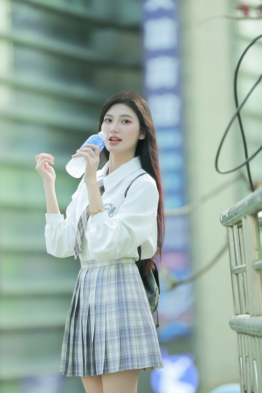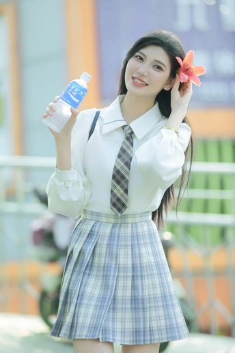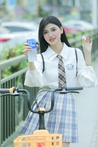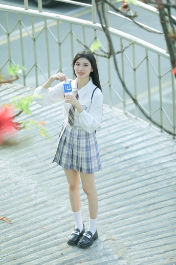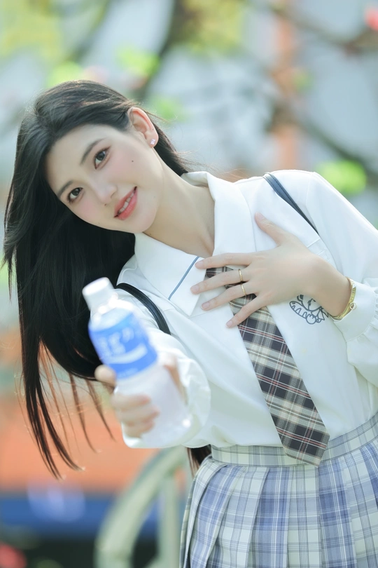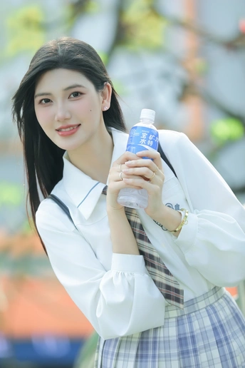 阳光倾洒,她身着清新的校服,格子裙与白衬衫相得益彰。手中握着宝矿力水特,瓶身闪烁微光。那笑容比春日繁花更灿烂,恰似微风中灵动的诗行,每一眼,都是心动的篇章。