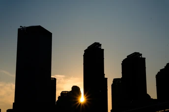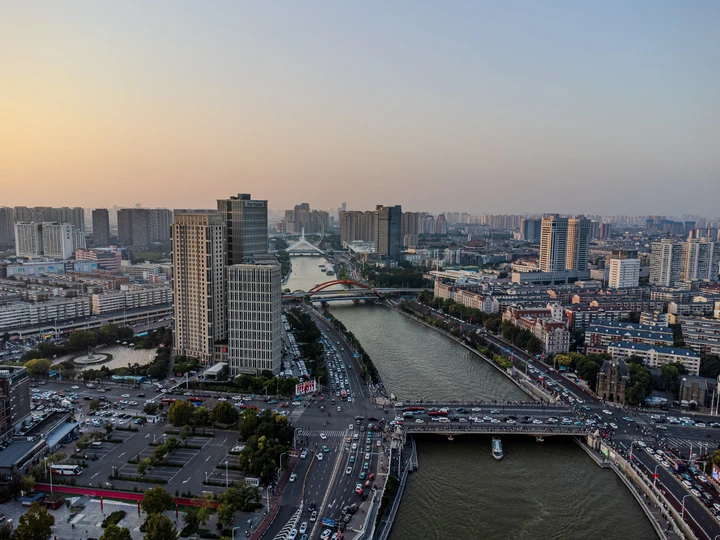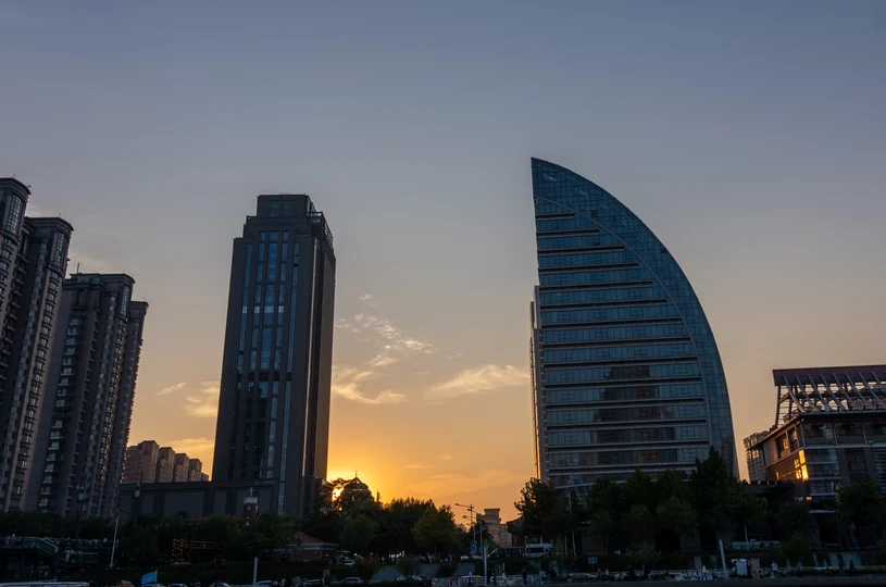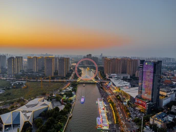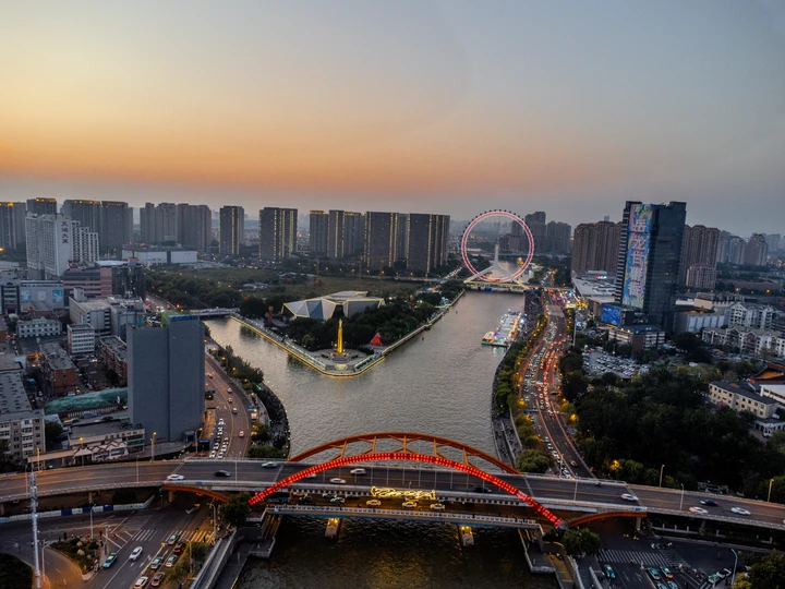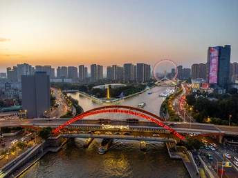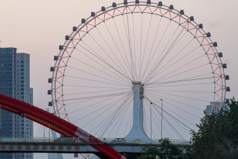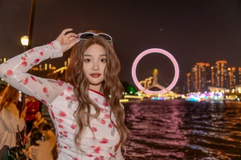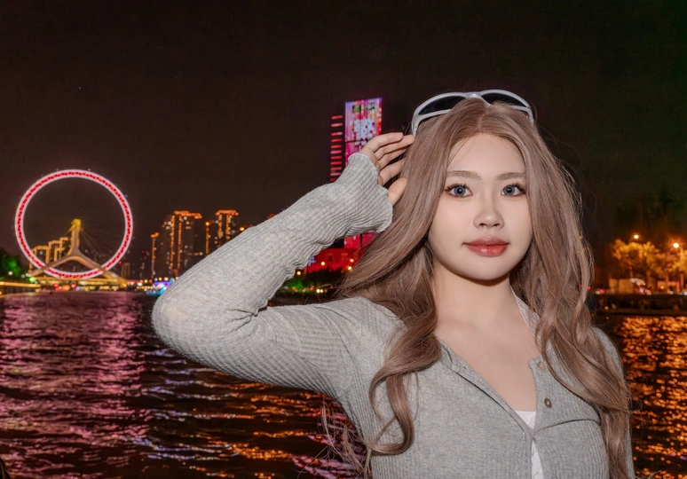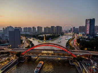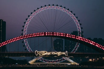当夕阳沉入地平线,这座流线型拱桥披覆着暖红霓虹,化作城市动脉跃动的琴弦。桥上车灯曳出光的五线谱,行人剪影在暮色中穿梭如音符。蜿蜒的河面将璀璨灯火揉成流动的金色缎带,倒影中巨型摩天轮徐徐旋转,与天际线勾勒出几何美学的天际轮廓。