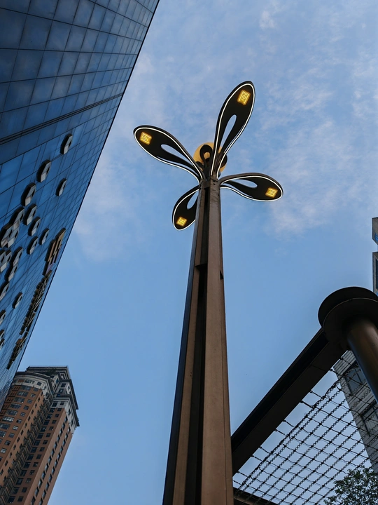 在城市的一隅,这盏造型别致的路灯如花朵般绽放在高楼之间。它于蓝天背景下静静伫立,似在守望城市的喧嚣与繁华,每一道灯光都藏着都市的故事,等待着夜幕降临,为行色匆匆的人们照亮前行的路。