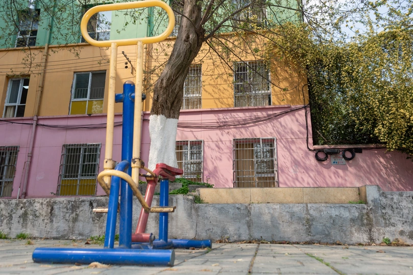 公园的春天,在一个幼儿园的后墙生长的七里香和墙面的色彩,其中照片主体颜色的色域是极为接近和谐的