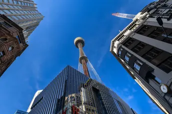 在城市的钢铁森林间,悉尼塔傲然挺立。它如同一支巨笔,直插云霄,书写着城市的繁华与梦想 。周围的建筑,或古典,或现代,簇拥着这座地标,共同勾勒出一幅壮丽的都市画卷。蓝天为幕,高楼作景,每一眼仰望,都是对城市力量与魅力的致敬。