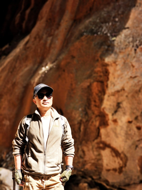 这位探险者的姿态显得自信而从容,仿佛在欣赏周围的自然美景或是准备迎接接下来的挑战。 整个画面充满了冒险和探索的气息,展现了大自然的力量与美丽,以及人类对未知世界的好奇心和勇气。