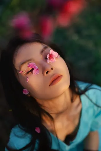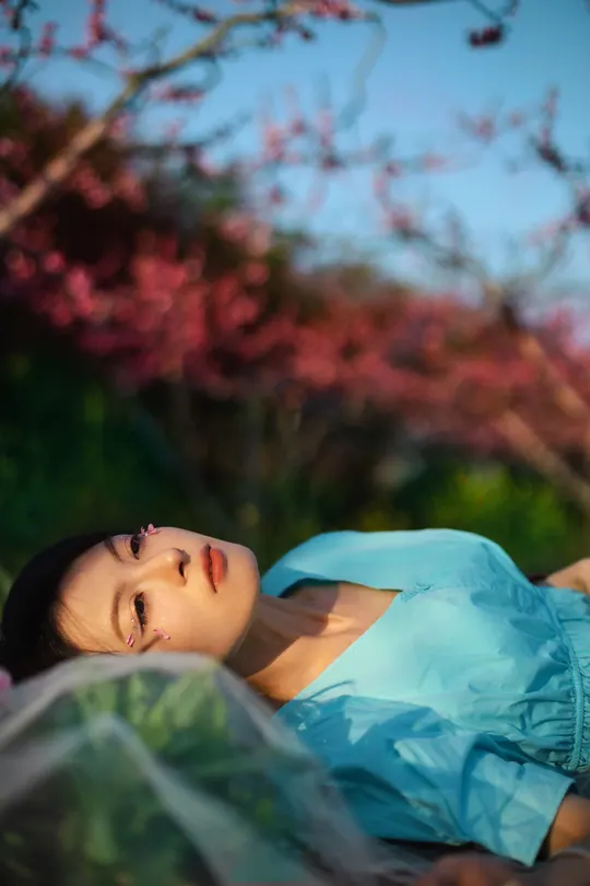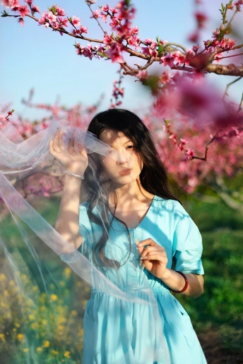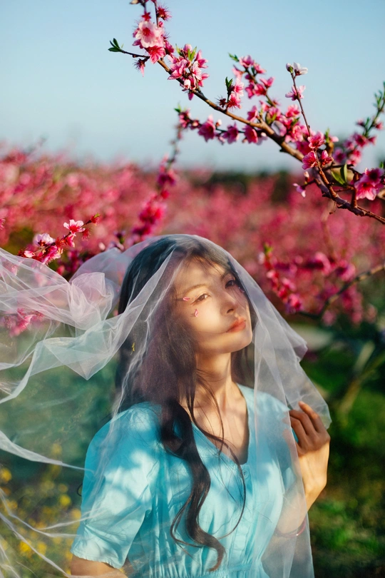 在春日的暖阳里,她静静伫立在繁花之间。那如火般热烈的花朵,簇拥着她,似是一场绚丽梦境的帷幕。