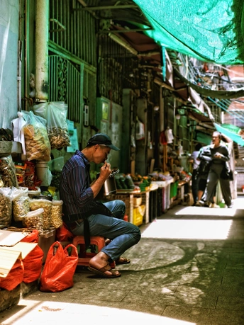 在这烟火升腾的老街巷,他每日为营生忙碌,身边琳琅的货品便是他生活的依托。清晨,他在烟火微光中备好饭菜,午后寻得一方角落,简单落座。手中的容器盛着家常滋味,往来的人影、嘈杂的喧嚣都成了背景音。在这市井百态间,他细细品味着每一餐一食,于忙碌生活的缝隙中寻得片刻宁静。这质朴又真实的日常,是最动人的人间生活,满是生活的温度与力量 。