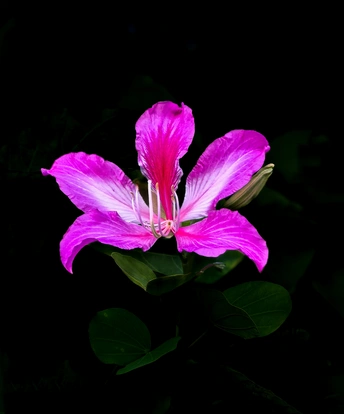 墨色为幕,洋紫荆绽若绮霞,粉紫交融间,花瓣舒展似舞。每一纹脉络,皆藏岁月诗行,于幽暗中璀璨绽放,诉说亲情深沉、生命热烈。光影交错,如梦似幻,醉了时光,美了流年。