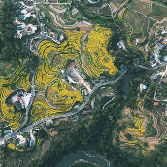 俯拍的视觉,花海线条感很强,和村庄相映成趣。