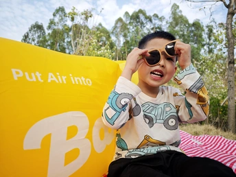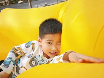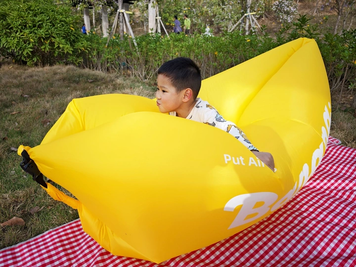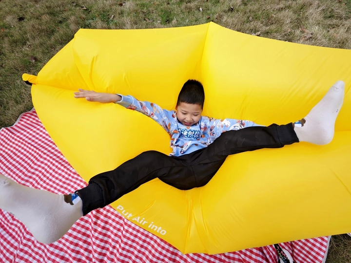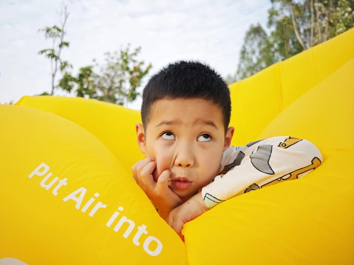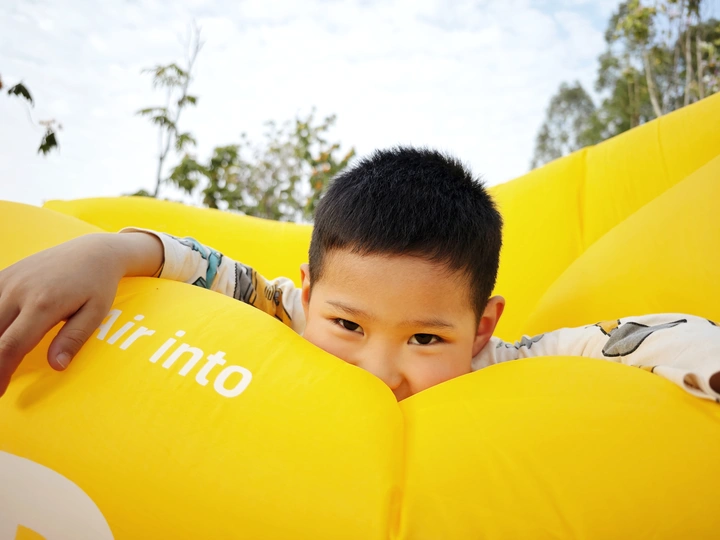 在公园露营,小宝贝在充气沙发上玩嗨了!