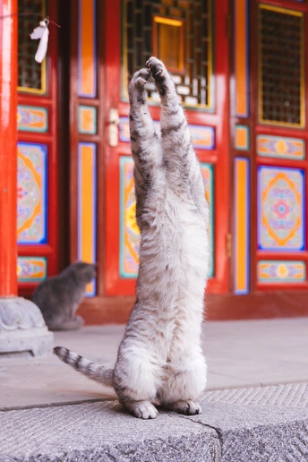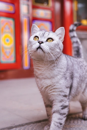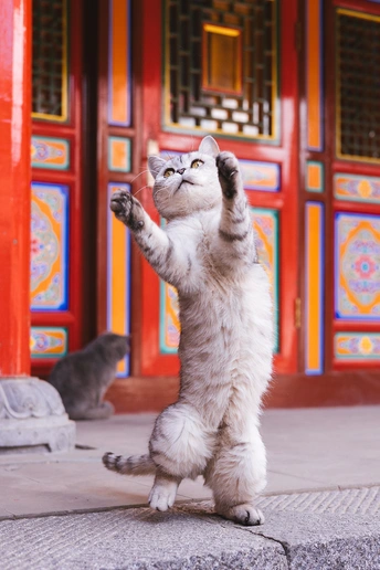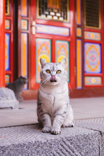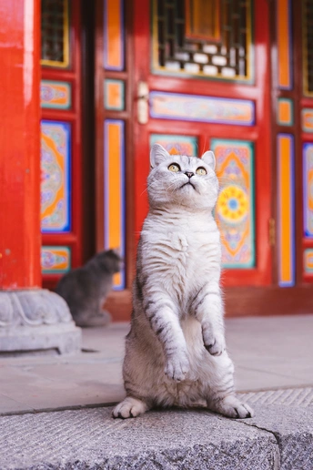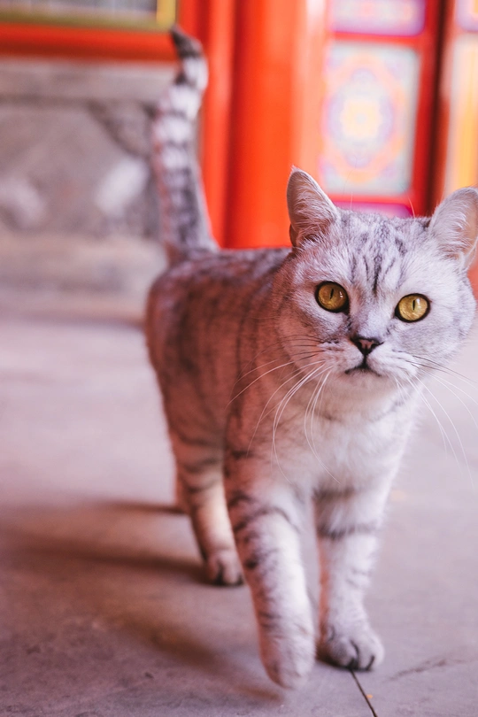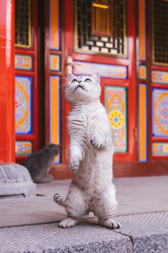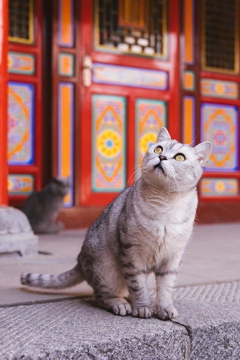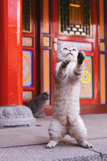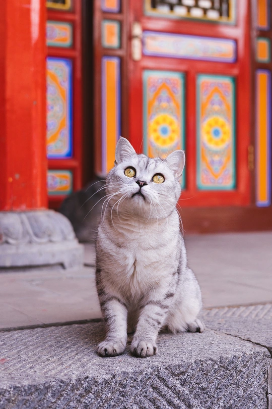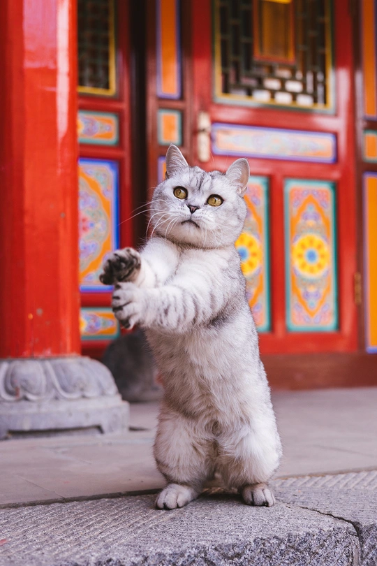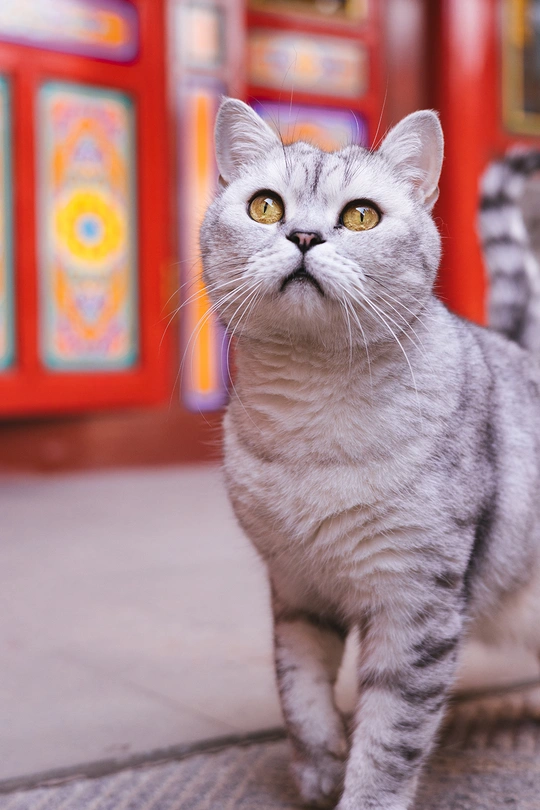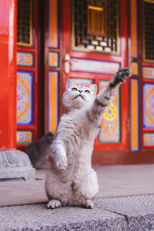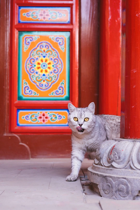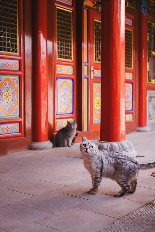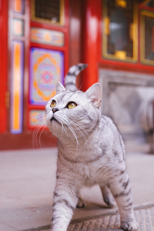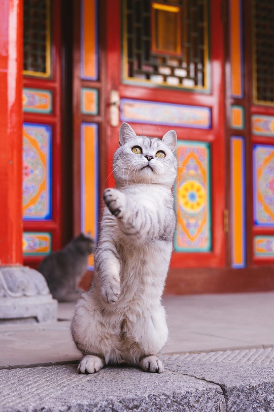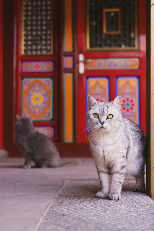 上次和大家分享的那只塔尔寺蓝猫,温柔亲人、安静陪伴,像个沉稳的老朋友。而这次要亮相的,是它身边这位“活力担当”——一只灵动好动、表情丰富的银灰小猫! 见到人就迈着轻快步伐迎上来,张嘴打招呼、站起来挥爪爪,活泼得像个热情的小主持人。 门前的彩绘背景仿佛专为它设计,不论是走路、卖萌还是原地跳跃,都是舞台感满满的高光时刻~ 一个温柔如水,一个活泼灵巧,塔尔寺的两只小伙伴就这样,一个守在光影之间安静凝望,一个在人群中欢快穿梭。只要见到他们,就是一场被治愈的双重体验。