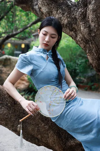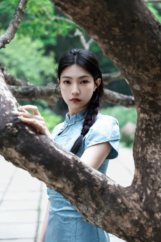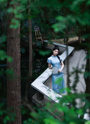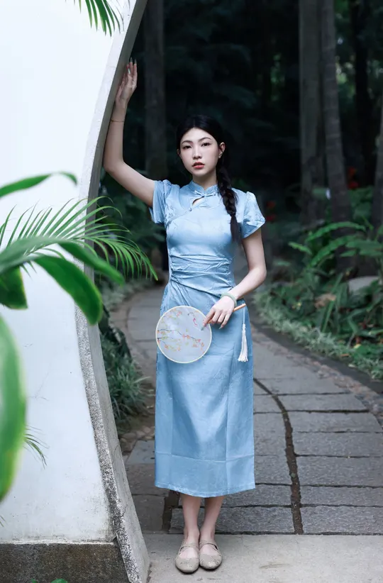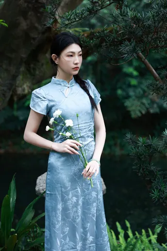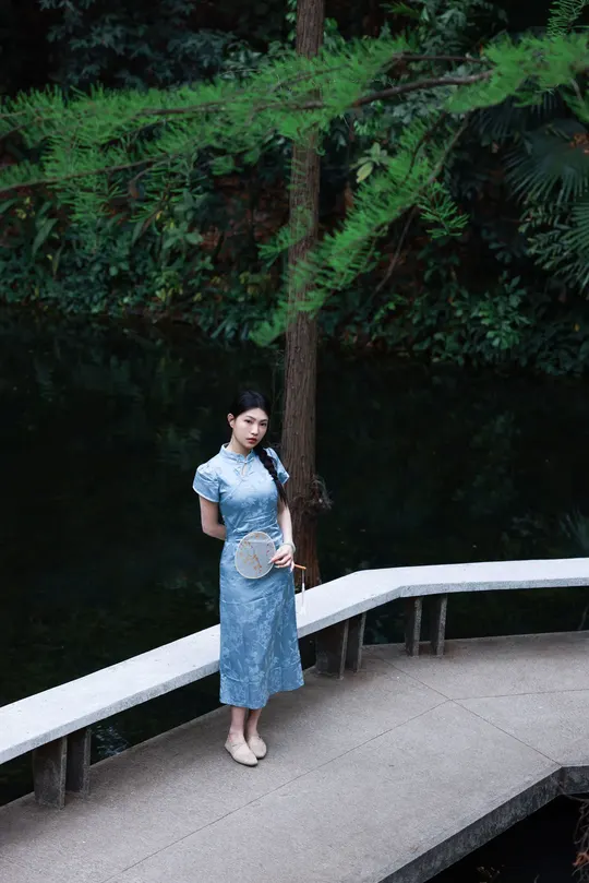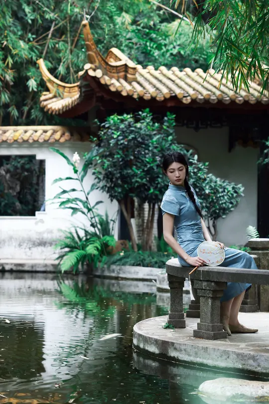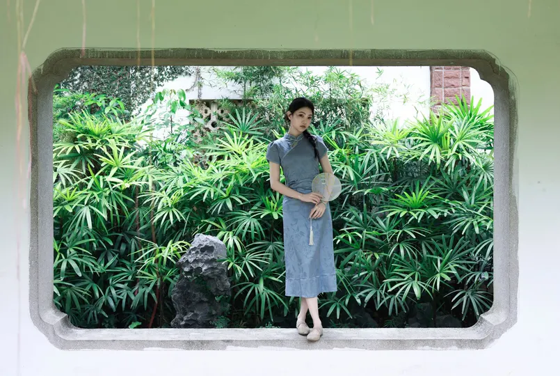 兰圃阴天似淡墨画卷:云滤强光,竹影勾墙,湖石洇润,兰瓣纹如工笔。 素旗袍踏石阶,苔砖映盘扣。九曲桥木栏随衣褶轻颤,惊起池涟漪。 镜头凝住瓦当水珠、蕉叶雨帘、漏窗映伞 —— 阴天兰圃,中式美在云影草木间显影