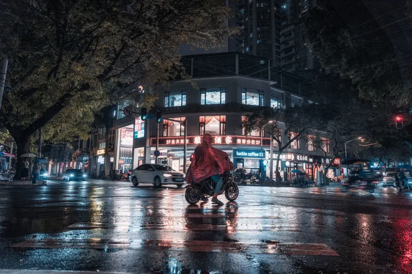 下雨天,开电瓶车的人恰巧停在路中间,马上抓拍这一画面。