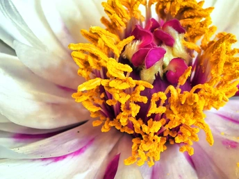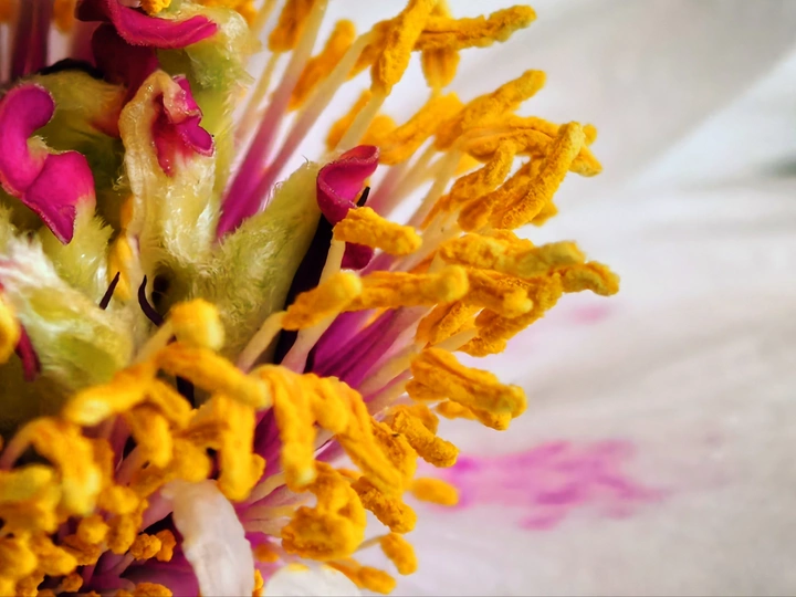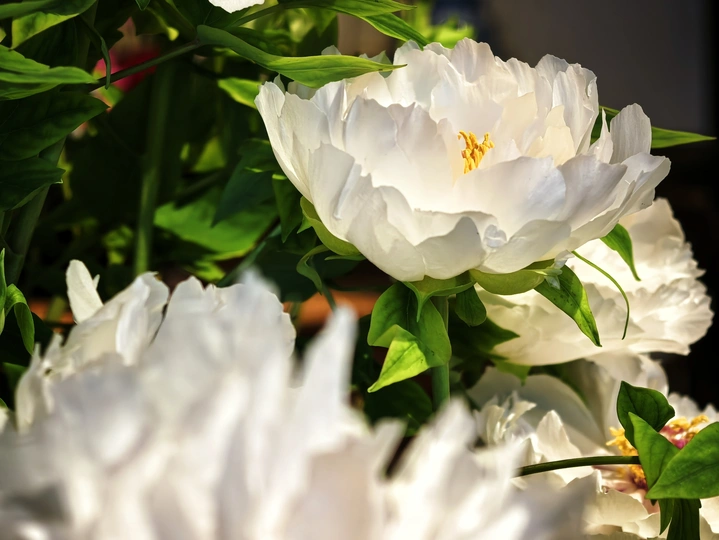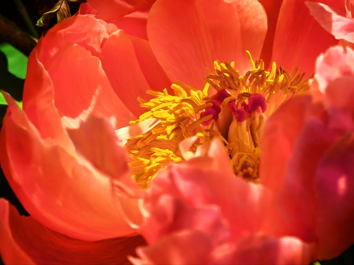 牡丹,于时光中优雅绽放。洁白花瓣似雪轻柔,橙红花瓣如霞明艳。花蕊似金丝点缀,或藏于瓣间,或展露人前,每一处细节都诉说着自然的匠心独运。
