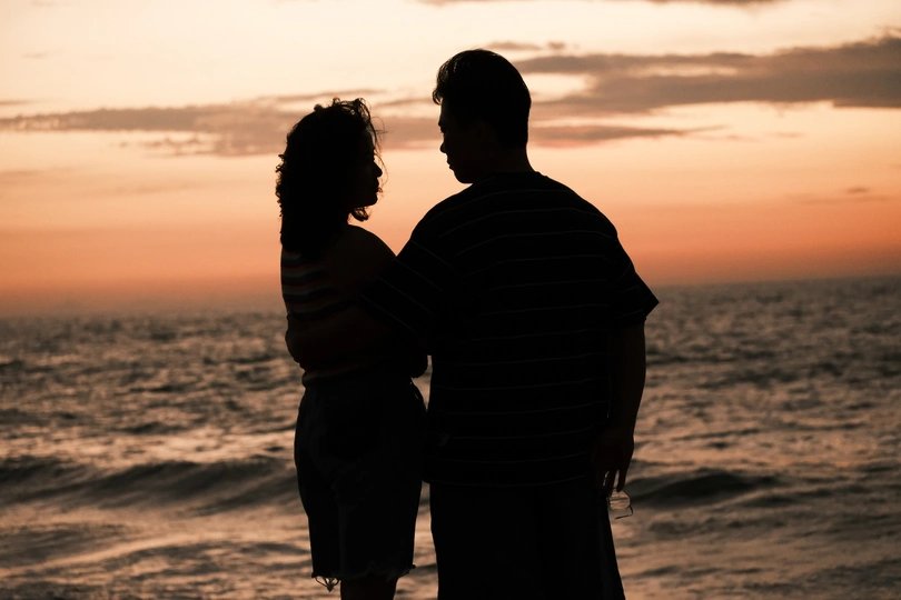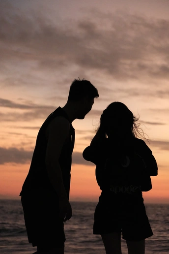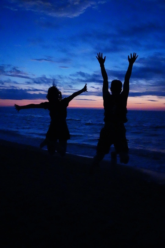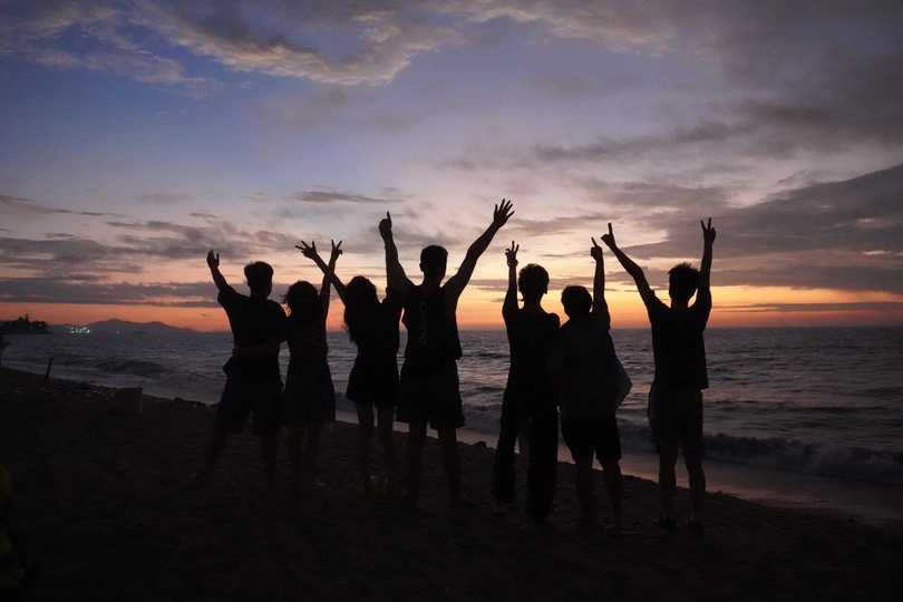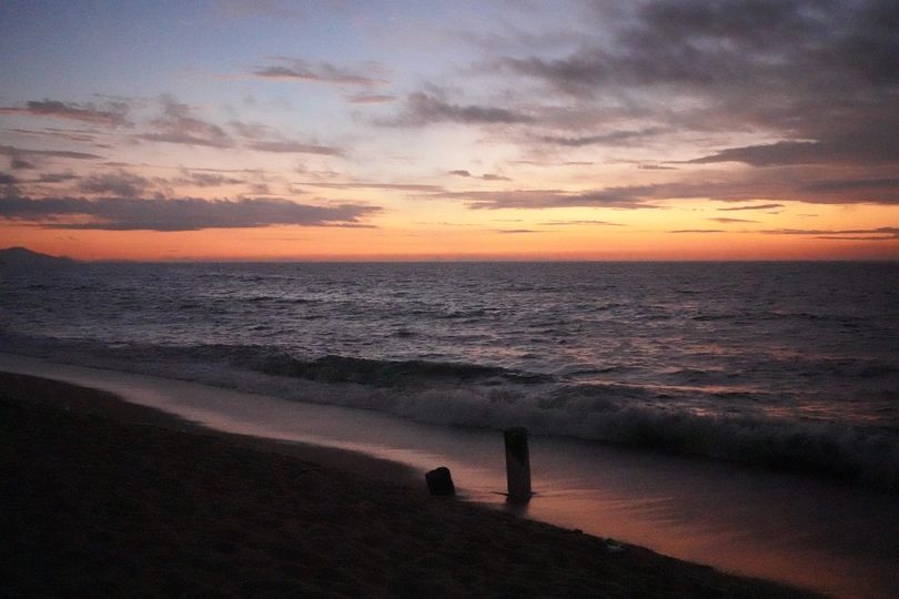 黎明的海边,日出照亮天边的云,也照亮了活动的人,人影走动!