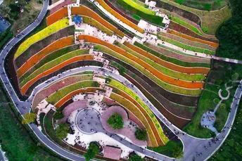 重庆璧山区的七彩梯田花海是一处令人惊叹的自然与人文景观。这片花海位于璧山区七塘镇境内,距离主城区约50公里,交通便利却又不失田园风情。 七彩梯田花海占地面积超过1000亩,采用梯田式种植方式,根据不同季节轮种各种花卉。春天是郁金香和油菜花的海洋,金黄色的花浪随风起伏;夏季则换上紫色的马鞭草和红色的虞美人;秋季则以菊花和向日葵为主打;冬季的羽衣甘蓝则让梯田依旧色彩斑斓。 这片花海的最大特色在于其独特的色彩层次感。种植者巧妙地利用不同花色搭配,在梯田地形上创造出宛如彩虹般的色带效果。站在观景台上俯瞰,各种颜色的花卉像颜料般在田野间流淌,形成一幅巨大的自然画卷。