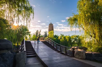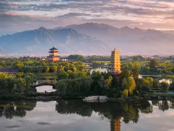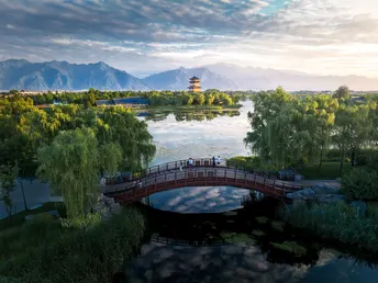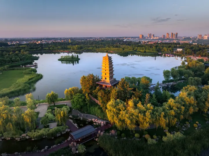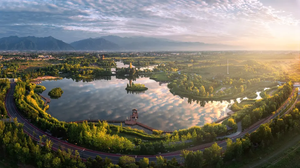 在鄠邑渼陂湖的上空俯瞰,一幅绝美的山水画卷在眼前徐徐展开。湖水如镜,清晰倒映着天空中飘动的云彩,仿若天空落入了人间。