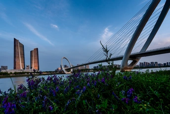 我想给双子塔拍张360度的照片,我想给南京眼和双子塔拍张合照,我想给这张合照前加上一个见证"者",于是我去拍了,有花有草相伴的南京眼和双子塔合照。