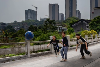 在这方天地间,脚步扬起轻快的尘。儿时的梦似那跃动的蓝球,于半空腾舞。身后是蓬勃生长的绿意,与新旧交替的建筑。