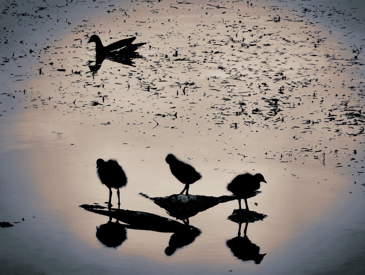 在这宁静的水域,时光仿佛放慢了脚步。鸭妈妈悠然地漂浮在水面,守护着岸边的绒毛小鸭。小鸭们站在浅滩,影子倒映在波光粼粼的水面上,像是大自然绘就的剪影画。这一刻,世界如此静谧,生命的美好在这简单的画面中尽显,每一个瞬间都诉说着亲情与安宁 。