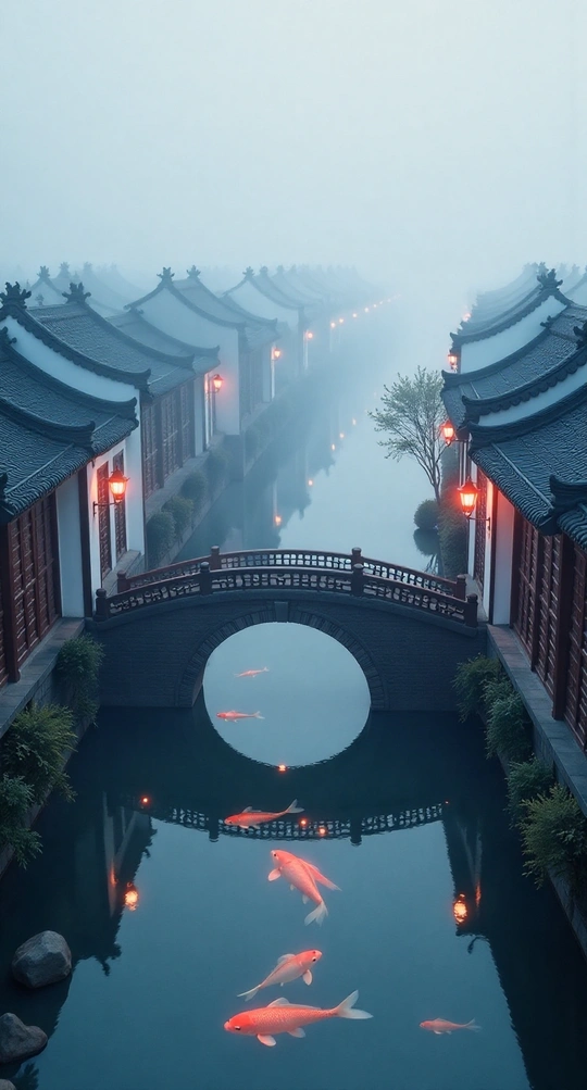 半透明锦鲤悬浮于发光溪流(鳞片具电路纹路),青石拱桥分解为几何粒子流,黛瓦白墙建筑群在晨雾中分形生长,薄雾呈现柔雾紫渐变,吴冠中水墨笔触材质美学,无人机45°俯角捕捉景深,虚幻引擎全局光照。
