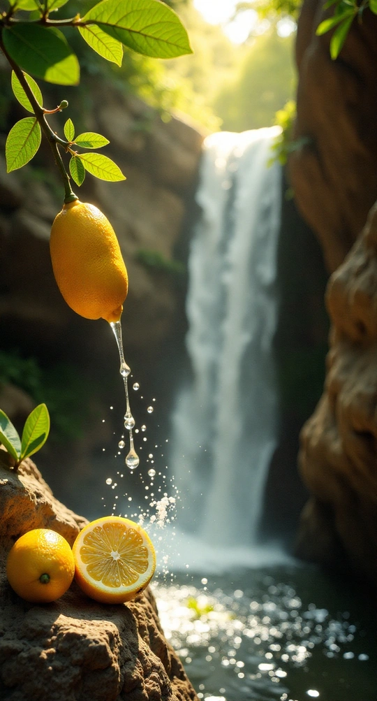 表皮凸起油囊清晰可见,坠入悬浮的威尼斯玻璃漩涡,爱琴海悬崖褪色壁画背景,沙黄色废墟中喷射镉柠檬黄,200%饱和度的酸性视觉冲击,凝固飞溅的柠檬汁液珠,顶光制造教堂彩窗投影。