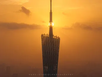 在日落?时,在猎德大桥拍延时。 因之前没有带无人机,这一次在拍摄延时的时候,打开无人机拍到了这一张。 使用无人机7倍拍照的。