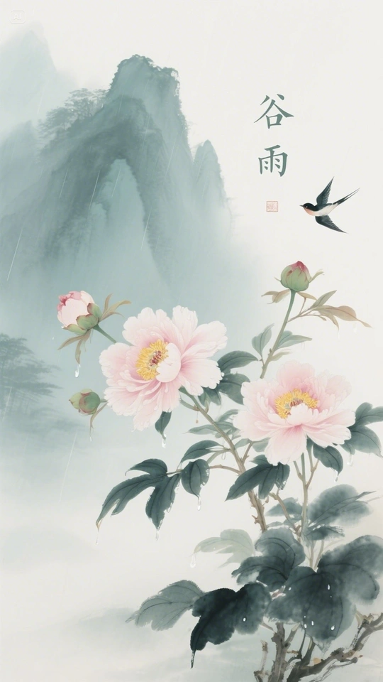 烟雨润墨色,青峰映牡丹,花瓣垂露,枝叶舒卷,淡雅朦胧间透出工笔细节,留白处飞鸟点睛,新中式禅意与自然灵动交融。