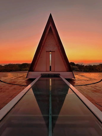 夕阳落在地平线时分,橙色的光芒灿烂美丽,在此为背景的教堂显的金碧辉煌,地面的反光照射恰好也给教堂阴面增加了橙色,使教堂更加梦幻。
