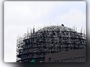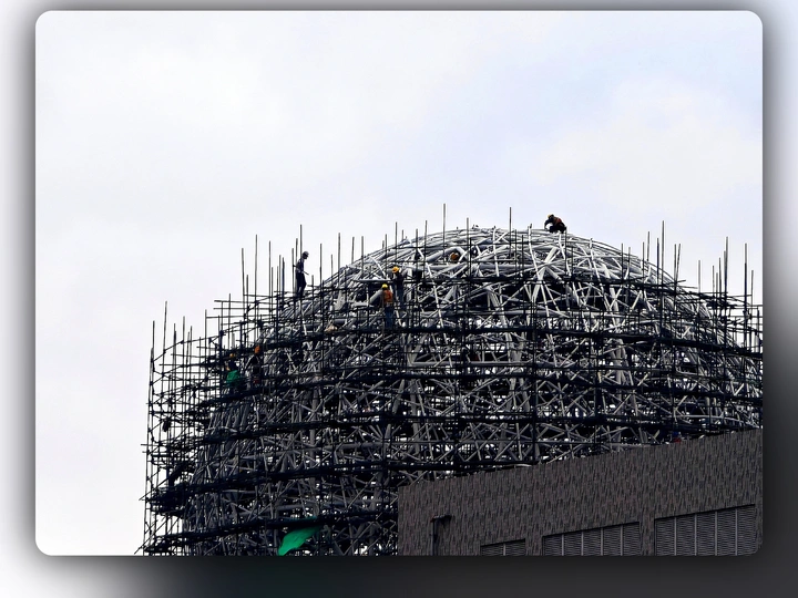 海岸边对面一球形建筑工人们正在加班加点施工,远远望去好像给人一种幻觉感觉置身于大空看见地球边缘工人在检修地球一样!