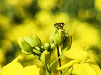 在明媚春光里,一只豆娘静静栖于油菜花苞之上。它那大大的复眼透着灵动,与明艳的黄色花海相映成趣。