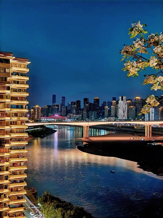 夜幕时分,路过山城巷,夜晚的灯光和江面冷暖色调对比,给人宁静的感觉。