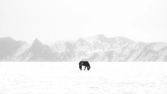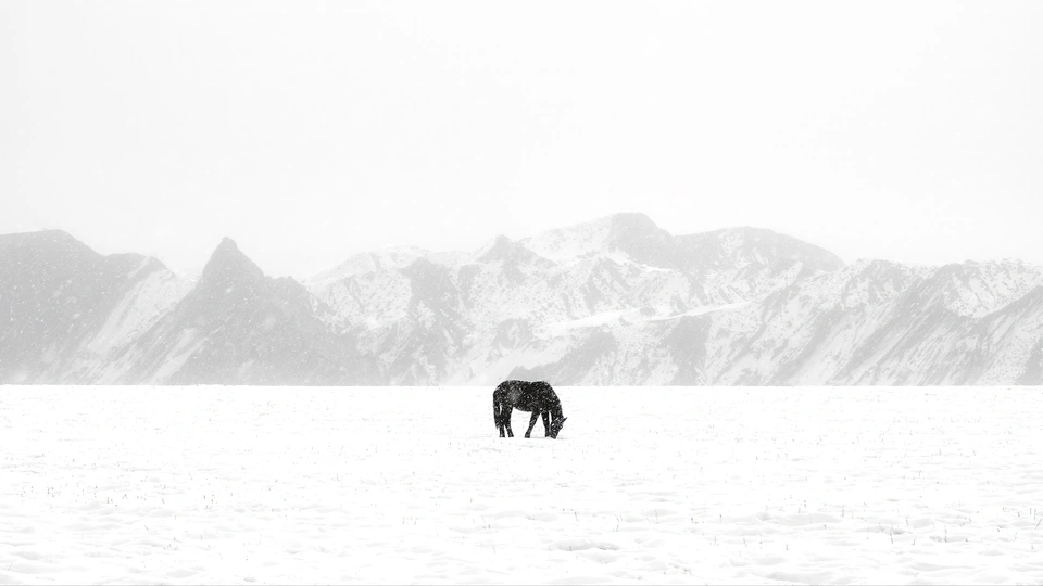 冬日中的安集海大峡谷,铁灰色的山脊在雪雾中若隐若现,像一柄被冻僵的青铜剑斜插在天际线上。一匹瘦骨嶙峋的马正用前蹄刨开薄雪,每刨一下便喷出白汽,鼻息在零下二十度的空气里凝成细小的冰晶。 它塌陷的肋腹随着呼吸起伏,鬃毛上结着冰溜子,像挂着某种残酷的装饰品。被积雪压弯的针茅草从冻土裂缝里探出头,马匹的嘴唇擦过草尖时,冰碴子就在它溃烂的嘴角划出新的血痕。 马蹄下的冻土突然传来冰河解冻前的嗡鸣,而马只是继续低头啃食,它睫毛上的霜花不断生长,如同正在被这片土地缓慢地同化成另一种结晶。