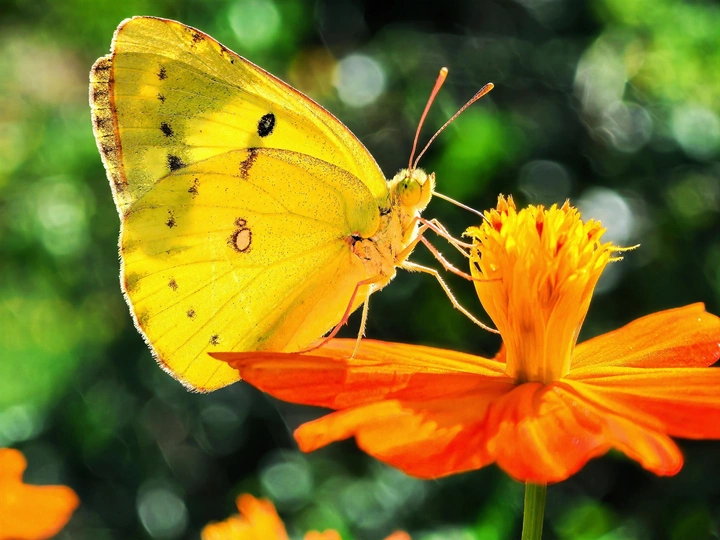 一只明艳的黄蝴蝶,轻盈地停歇在橙花之上。阳光倾洒,为它的翅膀镀上一层金边。那精致的纹路与花朵的绚烂相互映衬,仿佛在诉说着一场静谧而美好的邂逅