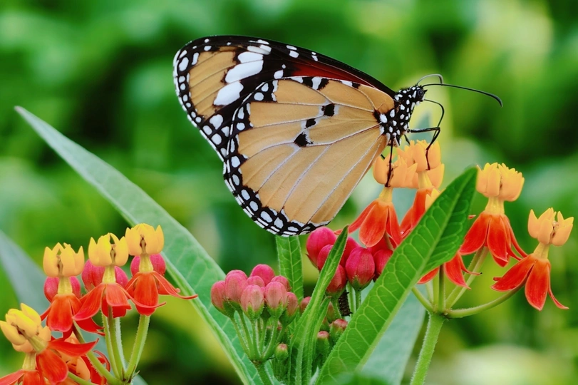 一只蝴蝶轻盈地落在斑斓的花朵上,它的翅膀如精致的彩笺,晕染着自然的瑰丽。在这方绿意簇拥的小天地,生命的灵动与芬芳悄然交织,每一片花瓣、每一道翅纹,都诉说着时光里的静谧与美好。