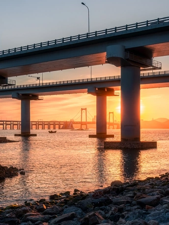 3月摄于大连,在桥下找到了一个很不错的日落观赏地,我用桥墩挡住了太阳,让阳光不那么刺眼,又保留了温暖的色彩,让画面稍微平衡。一个捕鱼船静静的停在海面,远处是星海湾大桥,大连真漂亮啊☺️。采用多张包围曝光。