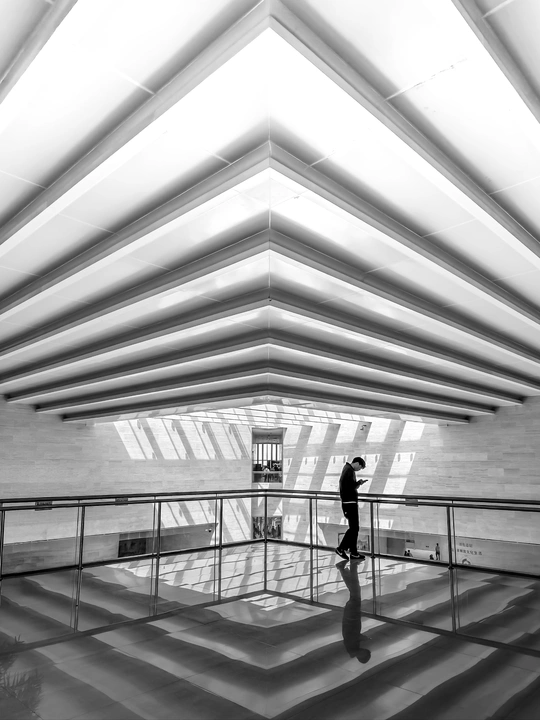洛阳博物馆中庭在光影衬托下,影射了建筑面的倒影,形成了现代建筑的结构几何线条美。