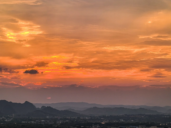 夕阳坠,霞似彩墨倾洒。橘红漫染天际,与墨色山峦相融。余晖轻拂,天地间绘就一卷静谧而绚烂的诗画。