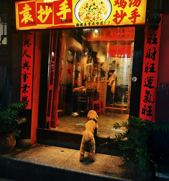 小吃店门口跑来一只小狗,探着身子往里张望,仿佛要进去做客。