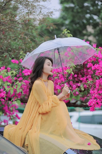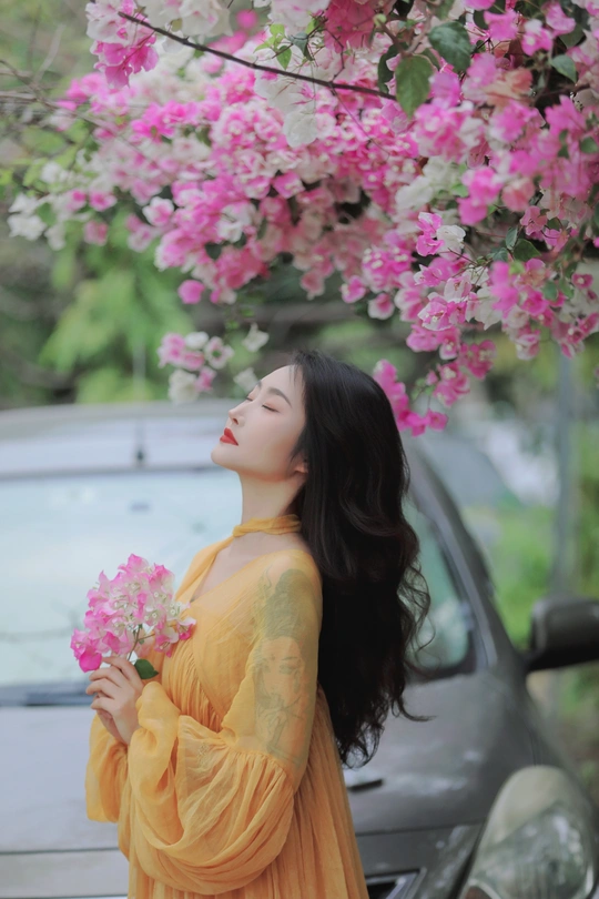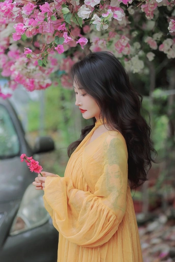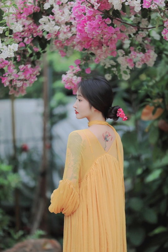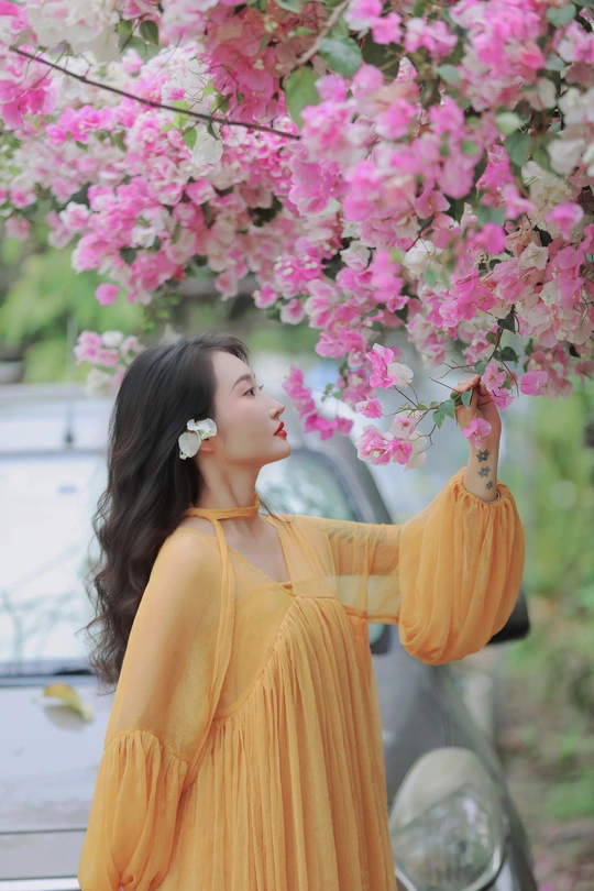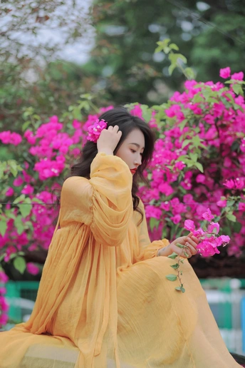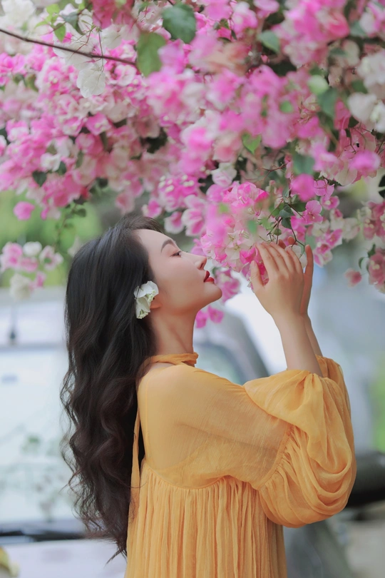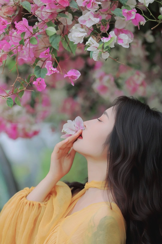 在这烂漫春日,她着一袭明黄纱衣,似与暖阳相拥。长发轻垂,一朵白花俏皮栖于耳畔。她抬眸,伸手轻触娇艳三角梅,鼻尖轻嗅芬芳。微风拂过,花瓣微动,时光仿佛在此刻凝驻,晕染出一抹诗意与温柔。