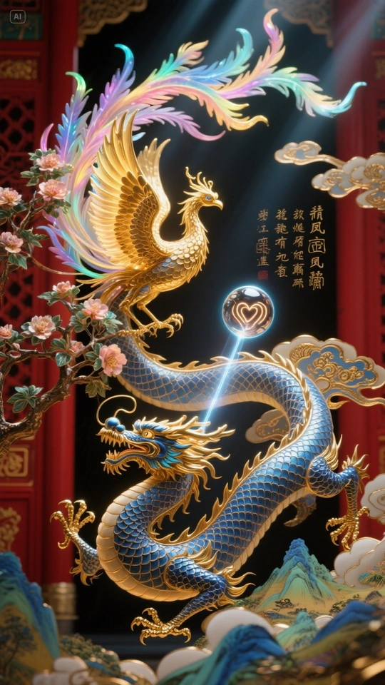 龙凤呈祥,蓝色苍龙盘踞玄铁山岩,金翅凤凰栖于琉璃梧桐,每片羽梢含渐变虹光镀层,靠近时触发磁场感应动画,龙目与凤冠产生能量光束交汇。