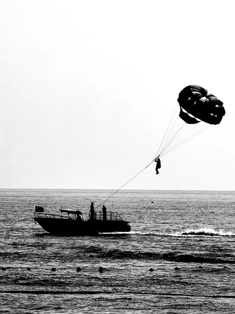 拍摄于深圳大梅沙,展现海上拖曳伞运动场景。画面中,一艘小船在海面行驶,船上人影隐约,似在操控牵引。空中,拖曳伞张开,下方悬挂着体验者,被绳索牵引升空